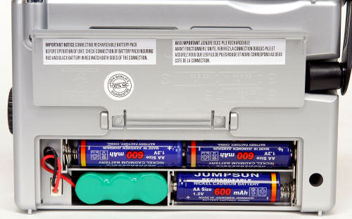 This rugged FR300 radio can be powered via the built-in rechargeable Ni-MH battery, Dynamo hand-crank can be used to recharge the built-in battery during emergency, or 3 AA batteries. Other features include an integrated flashlight and cell phone charger.