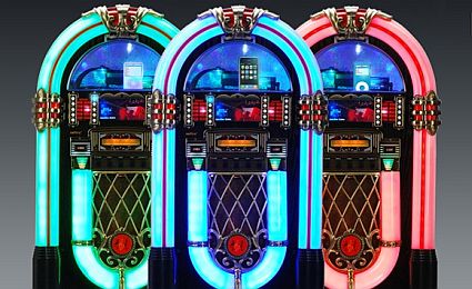 The Retro Tune Mini Jukebox is made of wood and plastic and resembles a jukebox with a built-in iPod dock, CD player, FM radio, alarm clock and rotating light column.