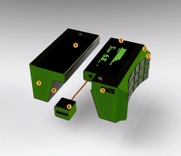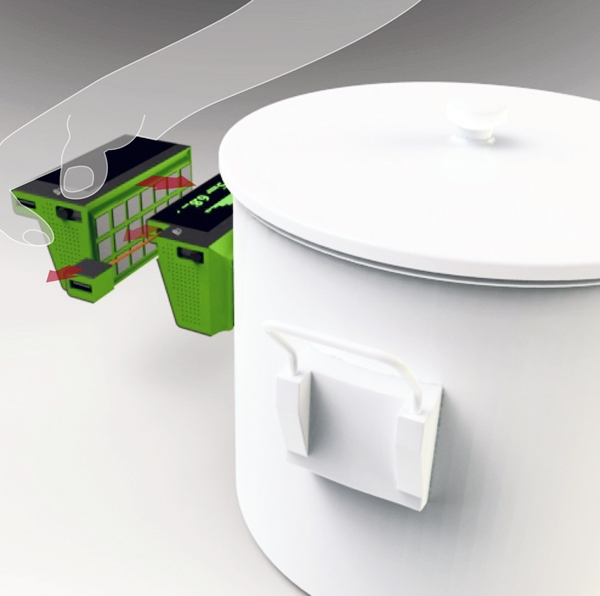System EcoCharge, presented by designer Ardavan Mirhosseini. This is a portable and environment friendly solution for the use of thermal energy. The device converts the energy released by the kitchen stove, and various heating devices to electrical energy, which can be used to charge the phone. The device is equipped with an LCD display, which displays information about how much energy can be obtained from any surface.