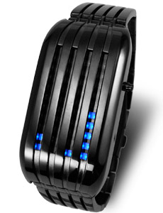 The two leftmost columns are for reading what hour it is, while the remain right columns tell the minutes. In the first column (from left to right), one LED blip means five hours, one hour for the second column, ten minutes for each LED lit in the third, and single minutes in the fourth. In the picture above, the time displayed is “10:15.”