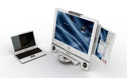 We have seen some really interesting notebook concepts earlier, including the dual-display Asustek notebook, Fujitsu’s Turntable PC, and the Canovo Dual Touch Screen laptop. Now, a designer named Yong-Seong Kim has taken a new approach to the design of notebooks. His Go-anywhere desktop docking solution features a large slot behind the LCD display. At this very place, you can slide your notebook in and access all its information from a desktop form factor. At the same time, the screen of the notebook becomes a second display (in portrait mode). The concept is quite inspiring but we don’t know if it will make its way to the shelves.
